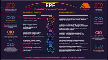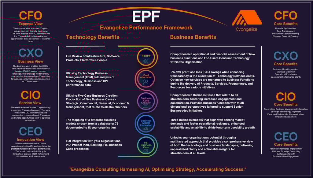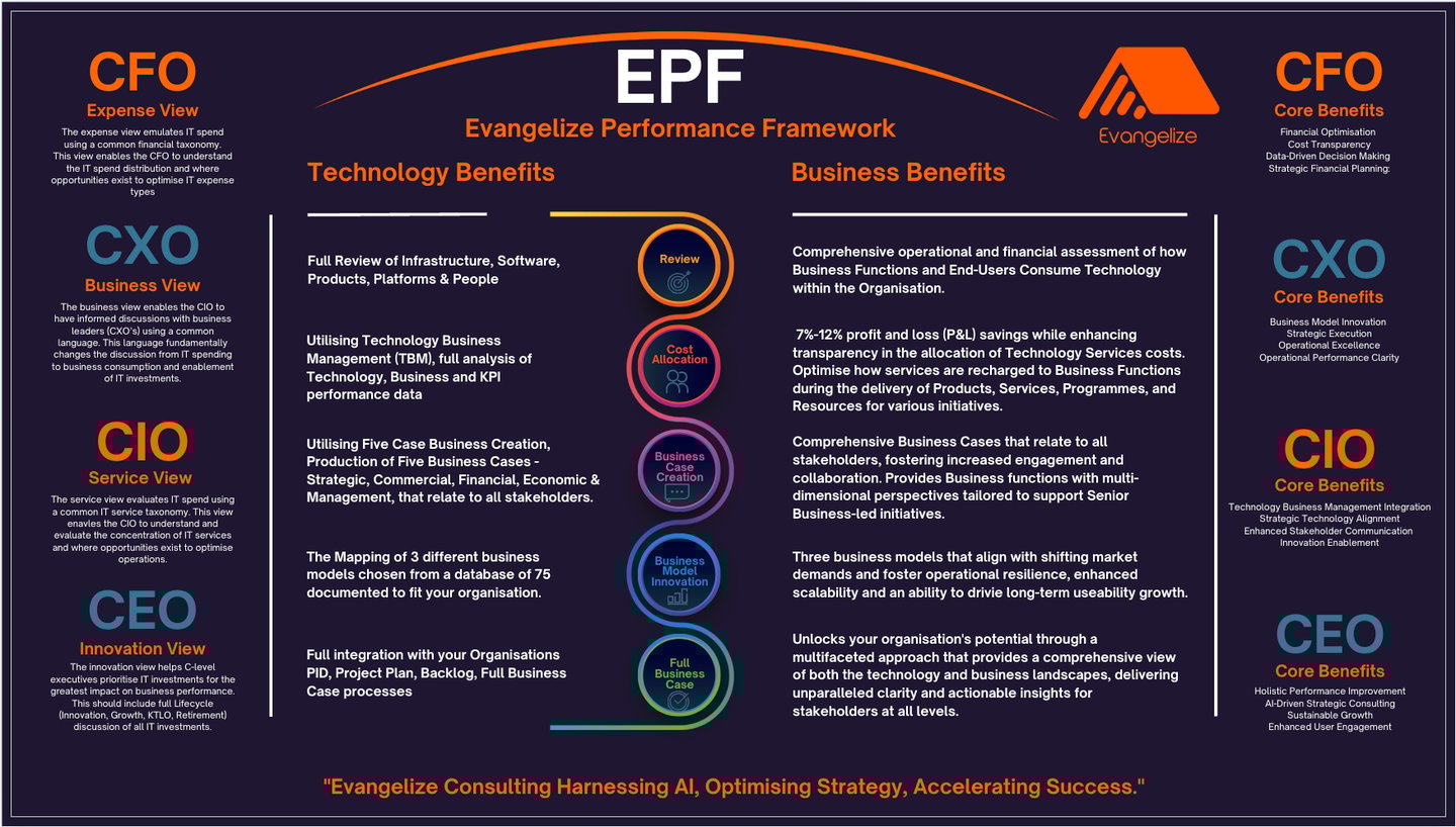The Evangelize Performance Framework (EPF) links technology investments directly to measurable business outcomes through a standardised taxonomy and cost allocation model.